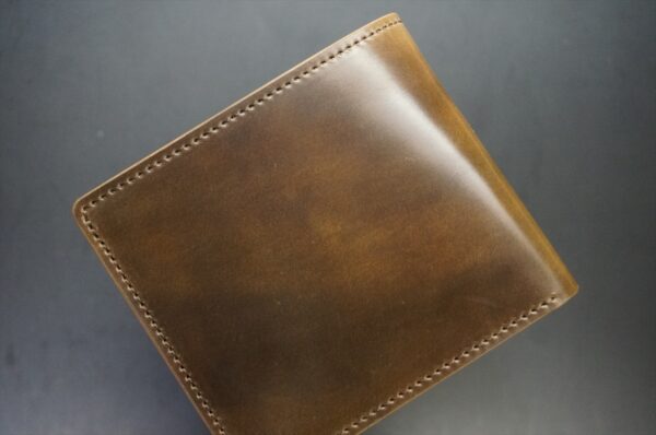 先日、初めて入荷をしたマーブルタイプのホーウィン社製シェルコードバンを使用した二つ折り財布が完成しました。