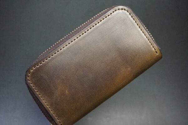 先日、初めて入荷をしたマーブルタイプのホーウィン社製シェルコードバンを使用したミニ財布が完成しました。