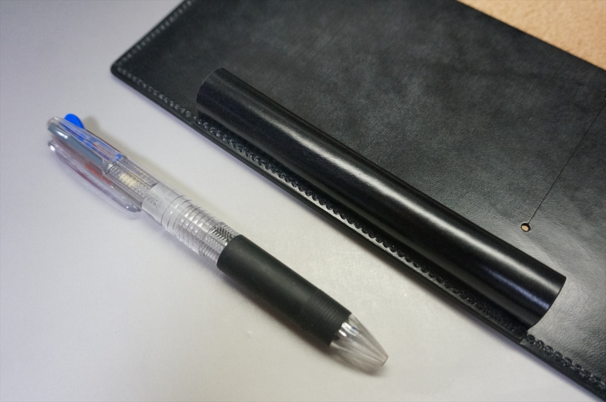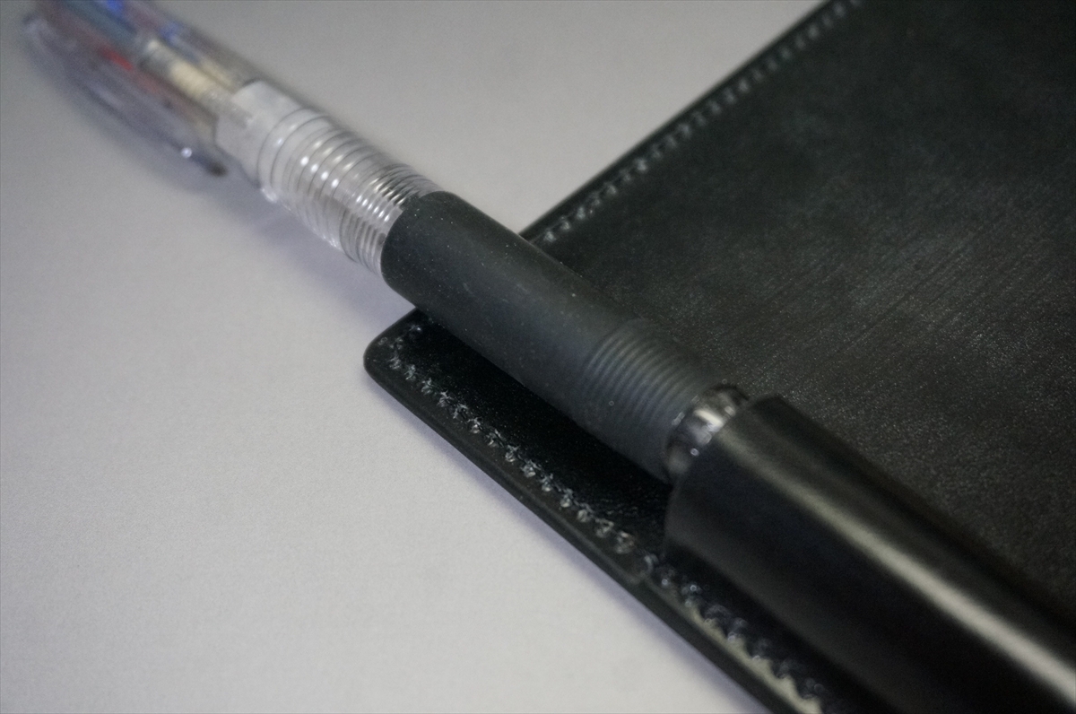 (持ち手がラバー仕様の太さ14mm程度の多機能ボールペンなどもスムーズに収納できます。)